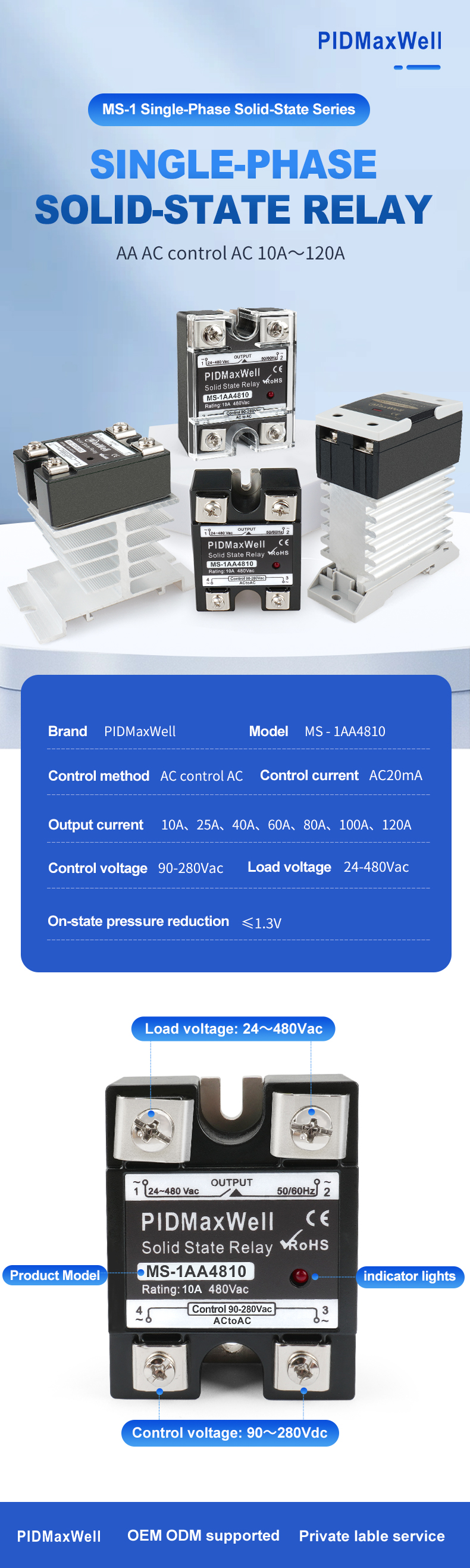 | Amplio rango de voltaje | Entrada de control de 90–280 VCA y tensión de carga de 24–480 VCA, compatible con sistemas de 110 V/220 V/380 V/480 V. |