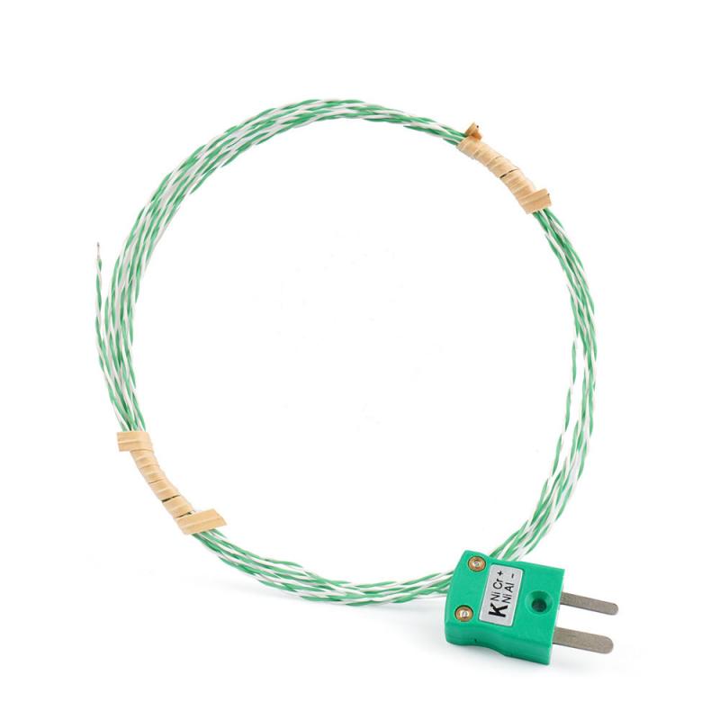 El sensor está fabricado con un par de cables de termopar de cromo-alumel (tipo K) de calibre fino, trenzados y aislados con una malla flexible de fibra de vidrio. La codificación de color verde y blanco del cable sigue la norma internacional para termopares tipo K, lo que permite una identificación clara de la polaridad. El aislamiento de fibra de vidrio ofrece excelente resistencia térmica y flexibilidad, lo que permite instalar el sensor en espacios reducidos y geometrías complejas sin riesgo de dañar el aislamiento.