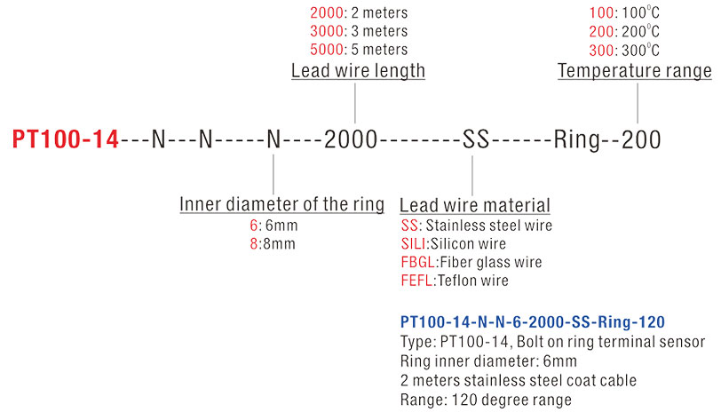 PT100-14 — [Campo 1] — [Campo 2] — [Diámetro interior del anillo] — [Longitud del cable conductor] — [Material del cable conductor] — Anillo — [Rango de temperatura]