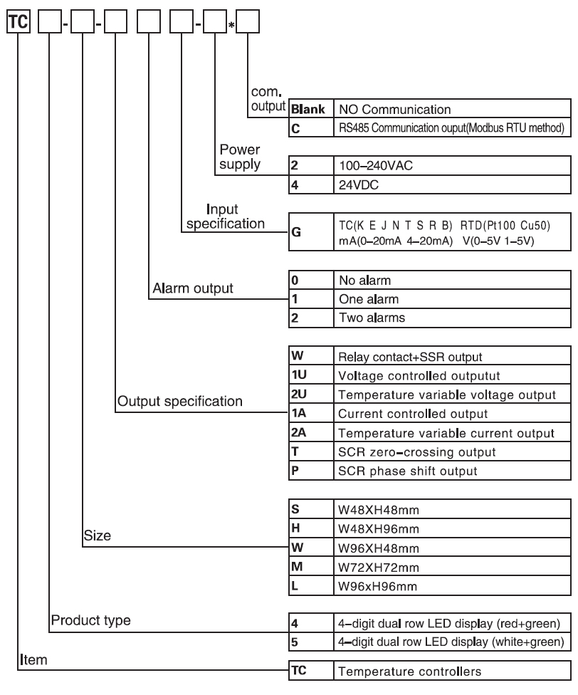 La versión estándar para este modelo es salida de relé + unidad SSR, más 1 alarma, si desea solicitar 48 mm * 48 mm, salida de relé + unidad SSR, 1 alarma, controlador de fuente de CA, a continuación se muestra el número de modelo correcto