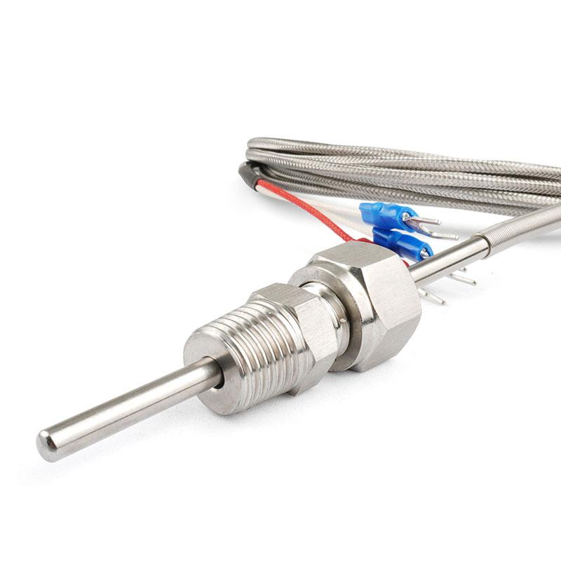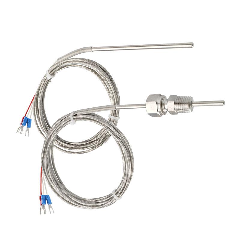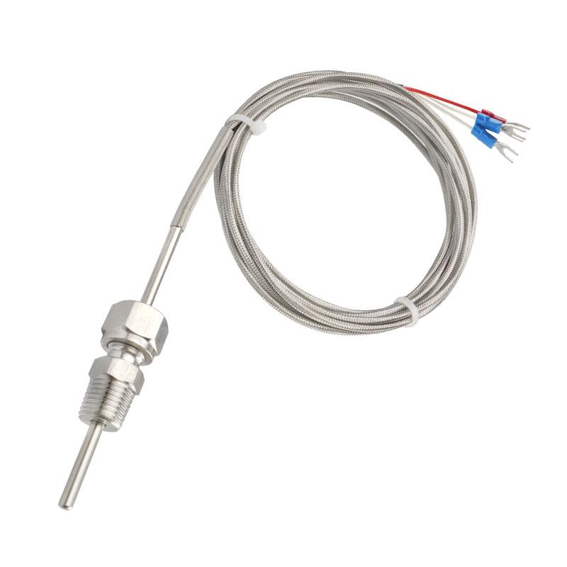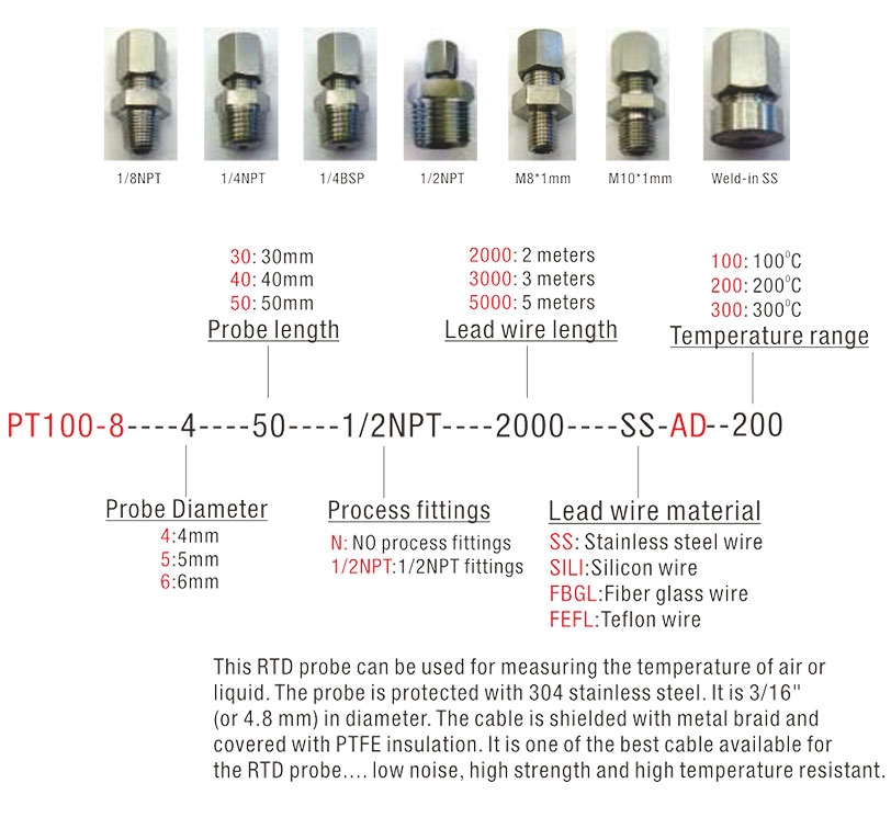 La sonda está fabricada en acero inoxidable 304 y está disponible en diámetros de 4 mm, 5 mm y 6 mm. El cable conductor está blindado con una malla metálica y recubierto con aislamiento de PTFE, lo que proporciona bajo nivel de ruido, alta resistencia mecánica y excelente resistencia a temperaturas elevadas. La PT100-8 es compatible con una amplia gama de conexiones de proceso, incluyendo roscas NPT, BSP y métricas, y está disponible en una configuración impermeable, lo que la hace adecuada para medir la temperatura tanto del aire como de líquidos en diversos entornos industriales.