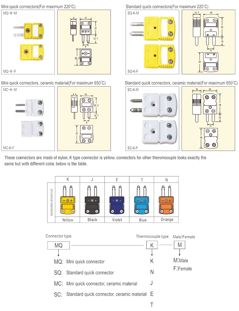 La serie de conectores rápidos se utiliza siempre que sea necesario conectar y desconectar sensores de termopar o cables de extensión de forma rápida, fiable y sin riesgo de errores de polaridad o de tipo.